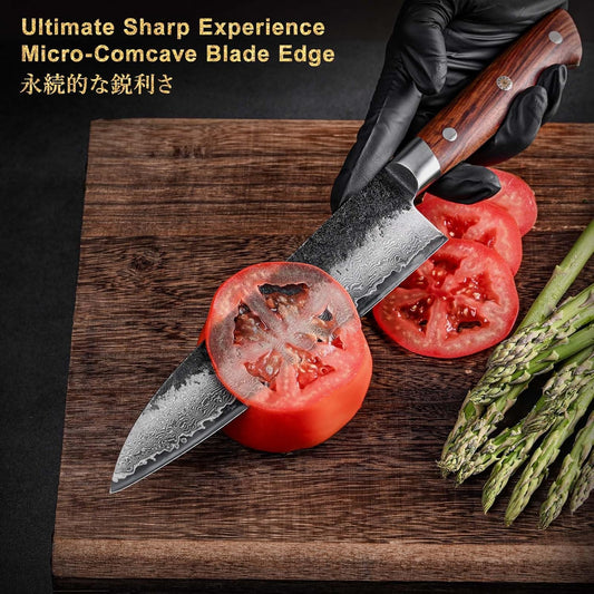 Each blade is wrapped in 67 layers of Damascus steel and finished with a stunning Kurouchi Nashiji texture, giving it a hand-forged, artisan look while improving food release and stain resistance. The result is a one-of-a-kind blade that combines tradition, durability, and elegance.
