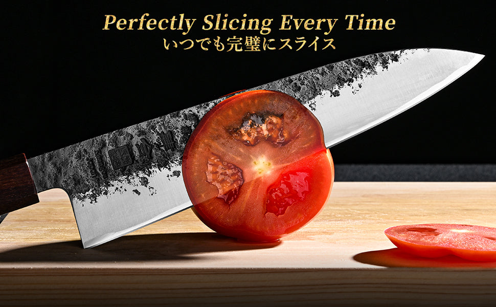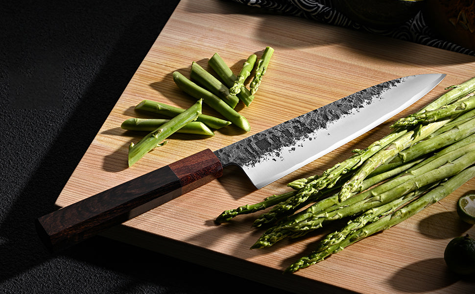 The Kanngou WA Series blends traditional Japanese craftsmanship with modern steel performance, creating a knife that's as beautiful as it is functional. Forged from premium Japanese AUS-8 stainless steel, each blade features a distinctive Kurouchi Nashiji finish, giving it a rustic, handcrafted appearance while enhancing rust resistance and food release.