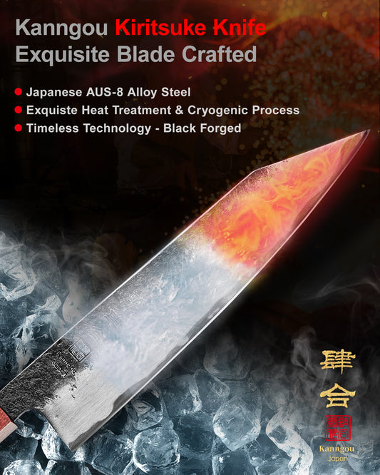 The Kanngou WA Series blends traditional Japanese craftsmanship with modern steel performance, creating a knife that's as beautiful as it is functional. Forged from premium Japanese AUS-8 stainless steel, each blade features a distinctive Kurouchi Nashiji finish, giving it a rustic, handcrafted appearance while enhancing rust resistance and food release.