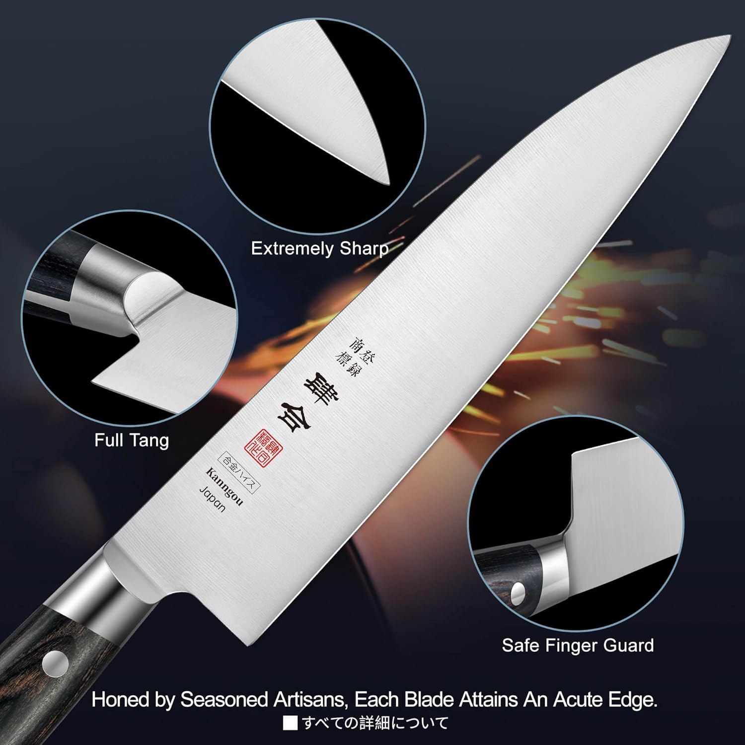 - JAPANESE ALLOY STEEL AUS-8 KNIFE CORE, SUPER SHARP: The KANNGOU Japanese knife is made from Japnese alloy steel AUS-8, a type of stainless steel known for its exceptional hardness (HRC 59±2), wear-resistant properties, and corrosion resistance. This gyuto chef knife offers unmatched sharpness through advanced forging techniques, ensuring its edge remains ultra-sharp even when handling tough tasks like meat cutting or deboning, thanks to advanced Japanese engineering