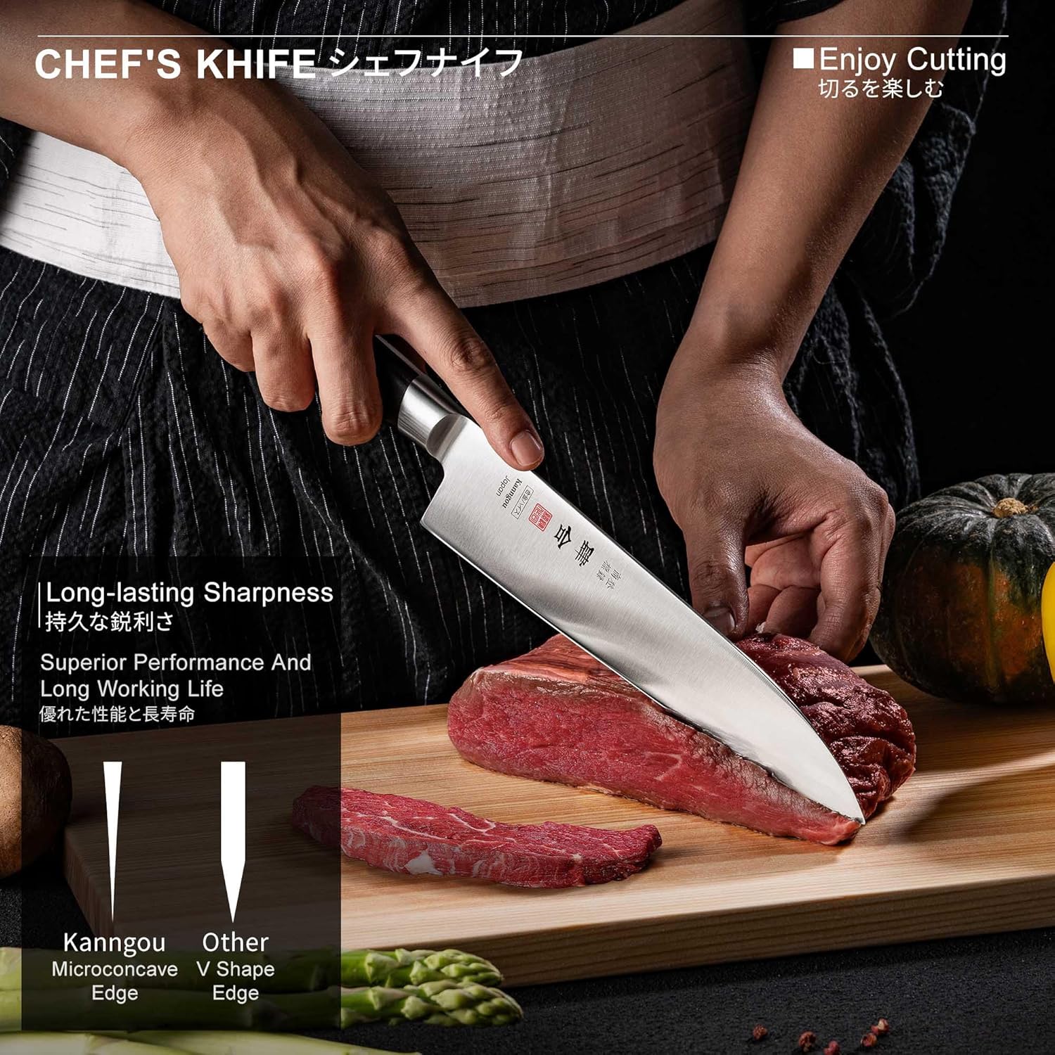 - RELEVANT FOR HOME COOKS AND PROFESSIONALS ALIKE: The versatile KANNGOU Japanese chef knife is suitable for cutting meats, vegetables, fillets, and bread, making it perfect for home cooks and professionals alike. Enhance your culinary skills with this 8.27-inch chef knife that effortlessly handles daily kitchen tasks like slicing, mincing, chopping, and dicing fruits, vegetables, fish, chicken, beef etc. Experience the ultimate all-around cooking knife