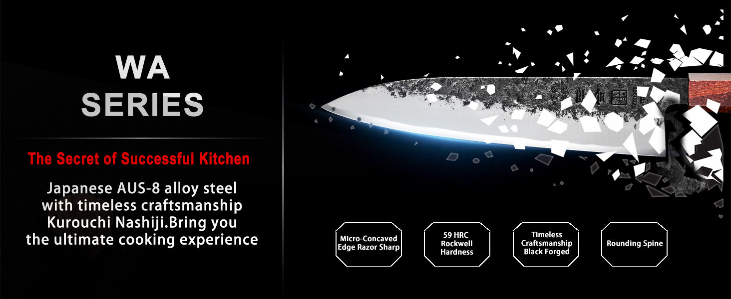 TheKanngou WA Seriesblends traditional Japanese craftsmanship with modern steel performance, creating a knife that's as beautiful as it is functional. Forged frompremium Japanese AUS-8 stainless steel, each blade features a distinctiveKurouchi Nashiji finish, giving it a rustic, handcrafted appearance while enhancing rust resistance and food release.