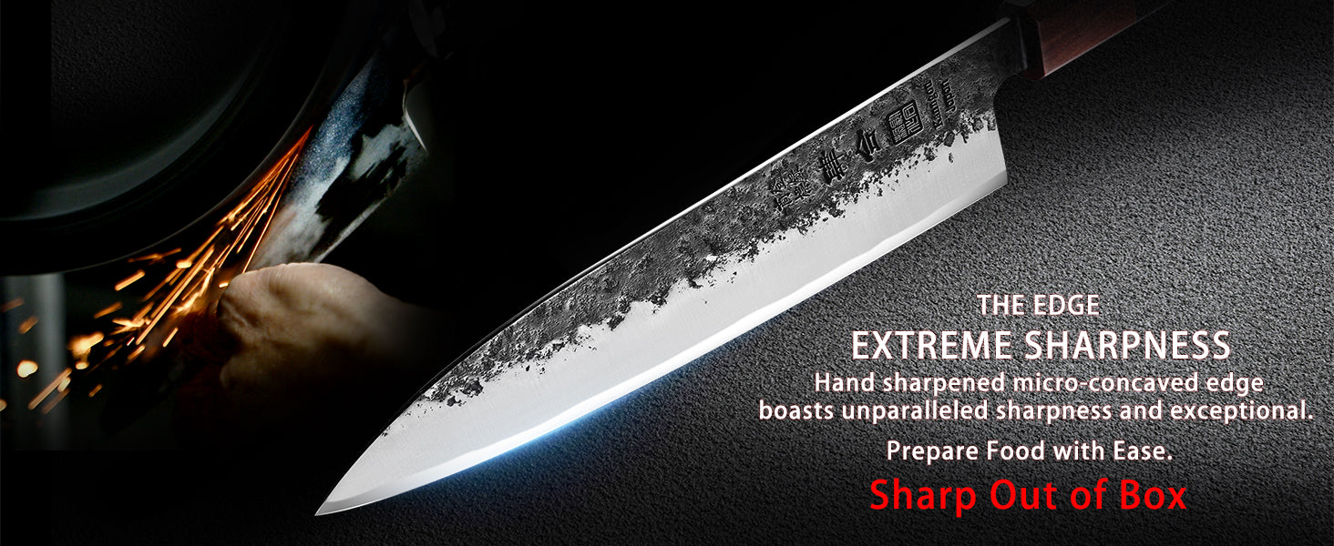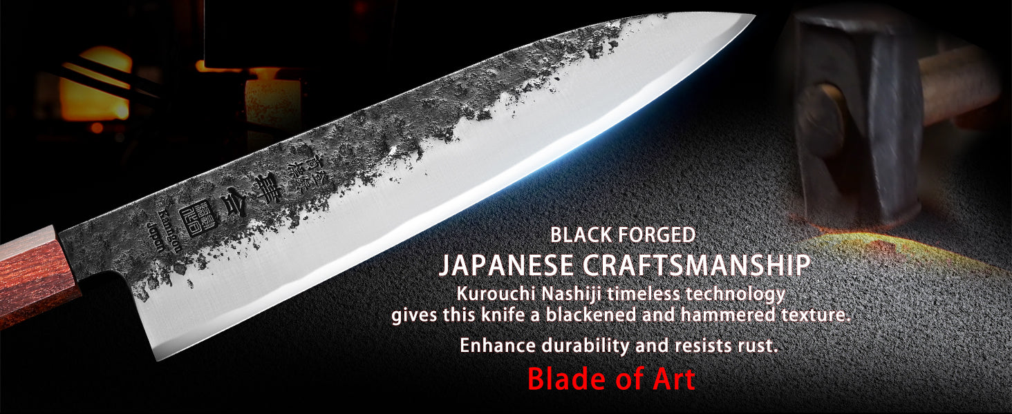 - Timeless Craftsmanship: The Kanngou Japanese Chef Knife is crafted using traditional Japanese techniques, specifically Kurouchi Tsuchime (Black-Forged). This process gives the knife a distinctive blackened finish that enhances durability and resists rust. The Tsuchime hammered texture not only looks impressive but also reduces friction, allowing for smoother cuts