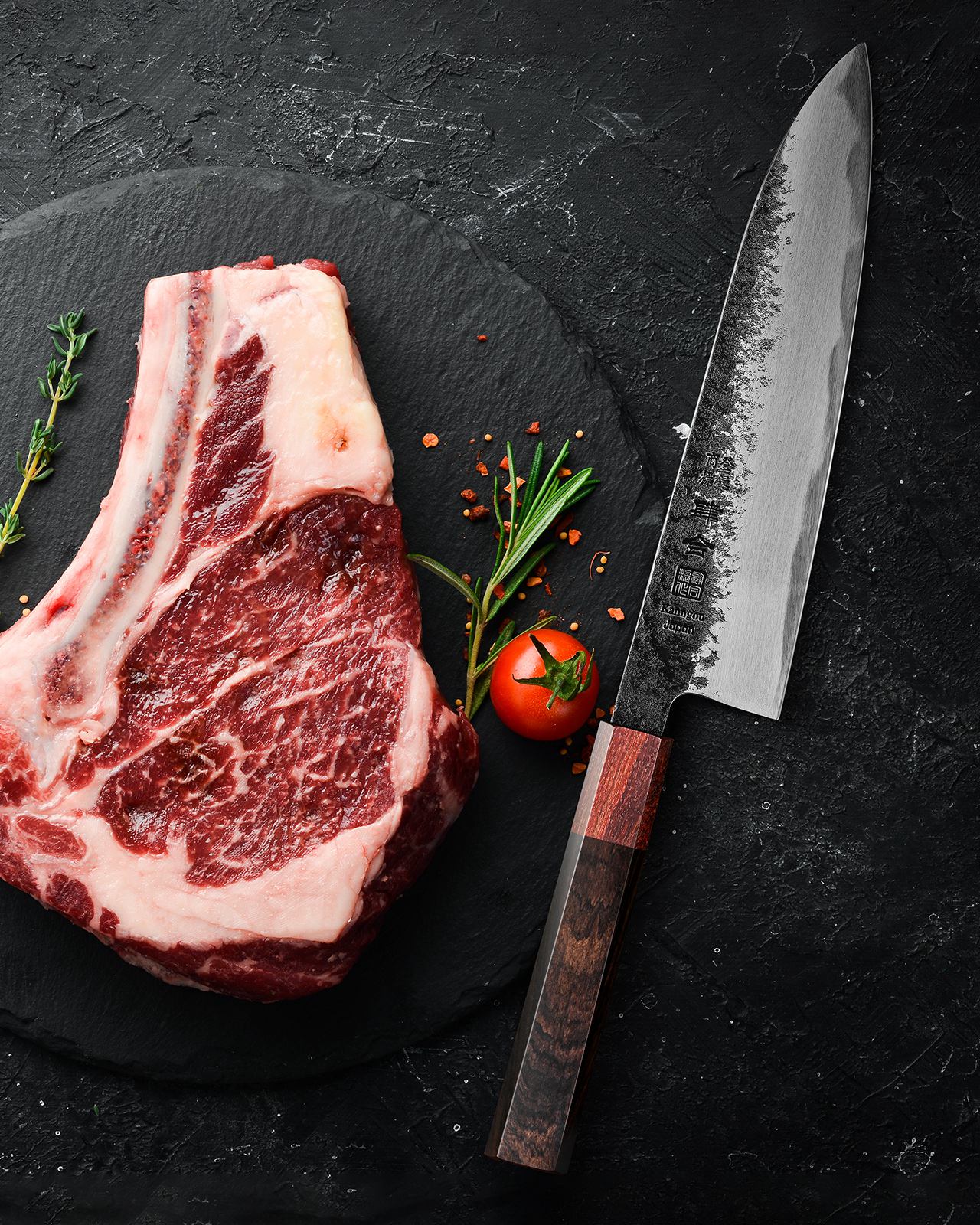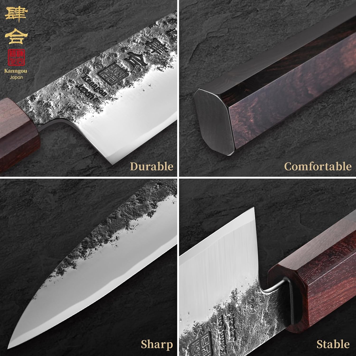 - Timeless Craftsmanship: The Kanngou Japanese Chef Knife is crafted using traditional Japanese techniques, specifically Kurouchi Tsuchime (Black-Forged). This process gives the knife a distinctive blackened finish that enhances durability and resists rust. The Tsuchime hammered texture not only looks impressive but also reduces friction, allowing for smoother cuts