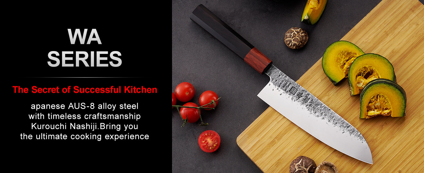 TheKanngou WA Seriesblends traditional Japanese craftsmanship with modern steel performance, creating a knife that's as beautiful as it is functional. Forged frompremium Japanese AUS-8 stainless steel, each blade features a distinctiveKurouchi Nashiji finish, giving it a rustic, handcrafted appearance while enhancing rust resistance and food release.