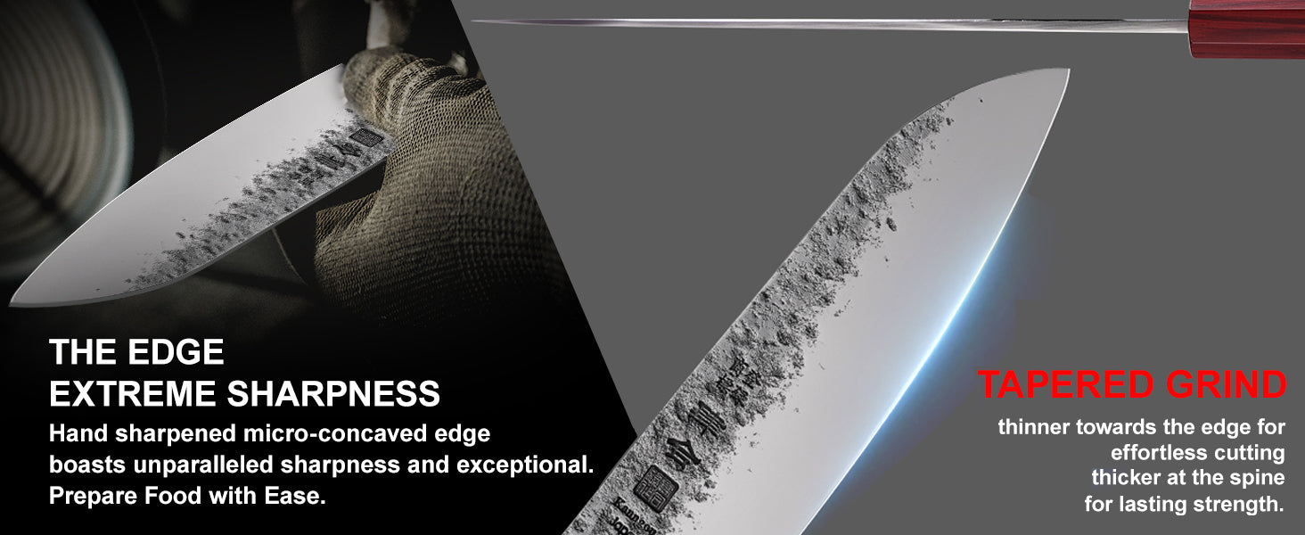 - Erginoic Balanced Handle: The Kanngou chef knife features a handle crafted from a blend of premium ebony and red sandalwood. This luxurious combination not only adds elegance to your kitchen but also provides a comfortable and secure grip. The balance and ergonomic design ensure precise, effortless cutting
